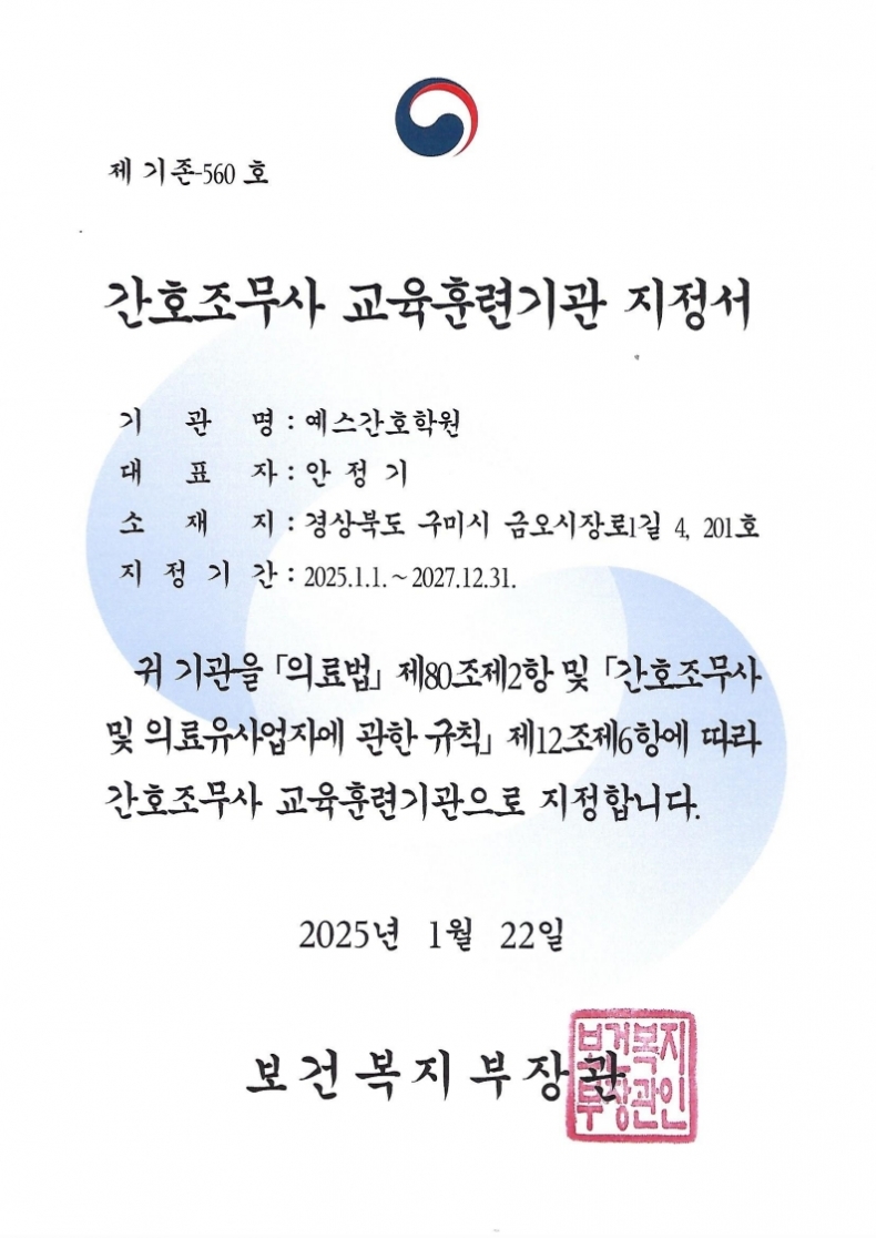 간호평가원으로부터 기존 교육 훈련기관 현장 평가 후에 3년( 2025.1.1~ 2027.12.31) 지정을 받았습니다. 간호조무사 자격 취득을 받고자 하는 훈련생들은 지정을 받은 교육기관에서 교육을 받으셔야 국가고시에 응시할 수 있습니다~ |