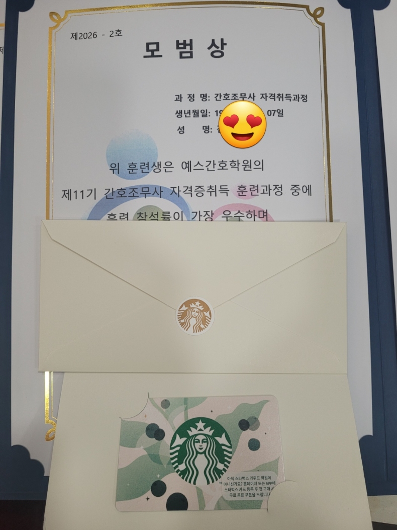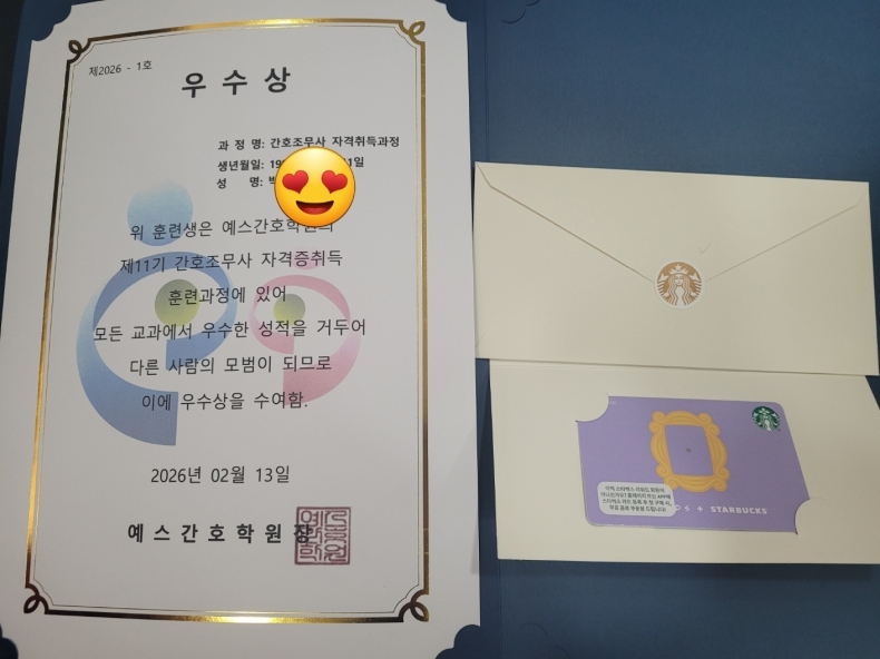 1년 동안 11기를 이끌어 오느라 수고한 대표 한*비, 공로상 받았어요...스벅 상품권!!